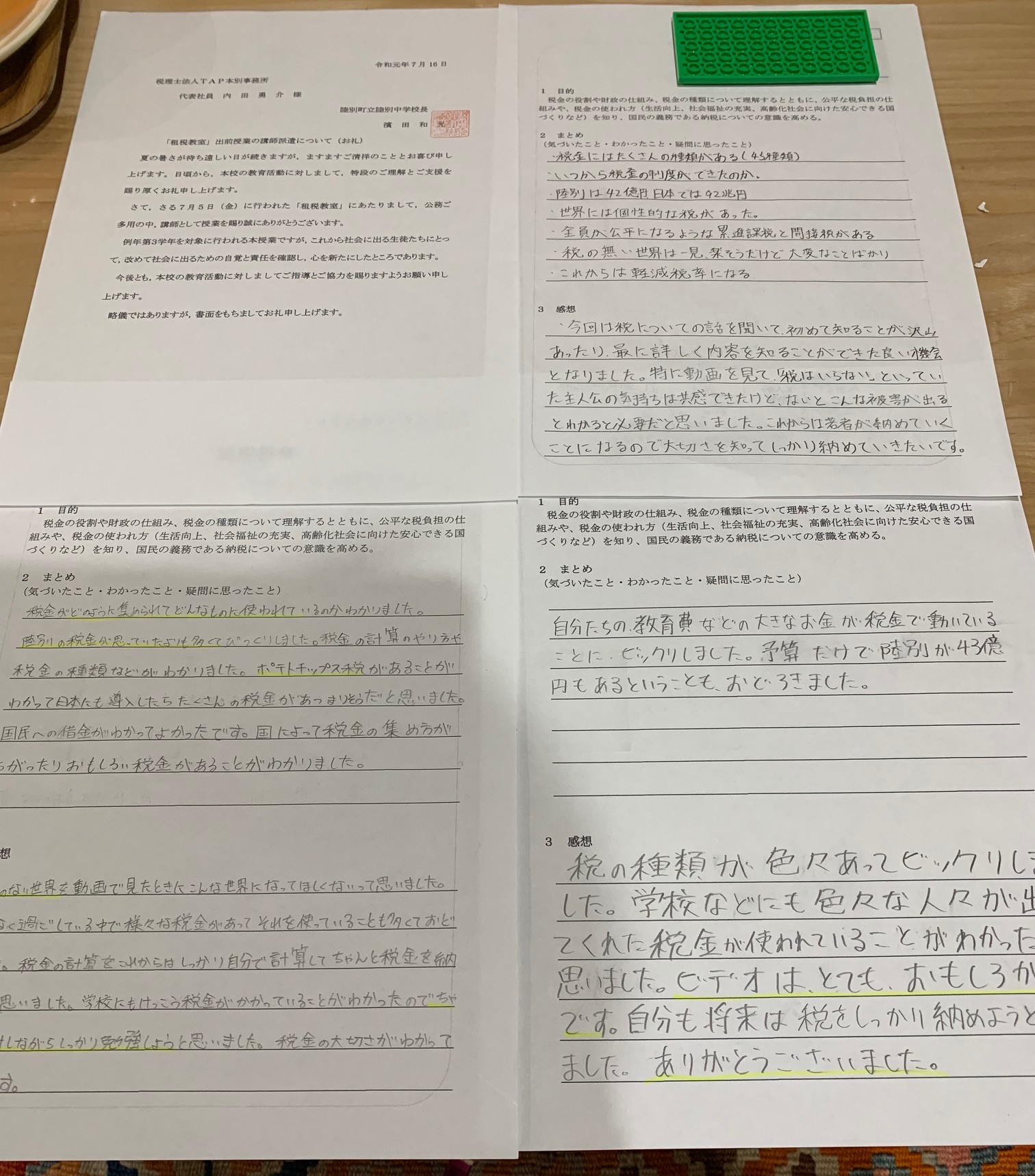 「このたびは租税教室をお忙しい中、教えていただきありがとうございました。」