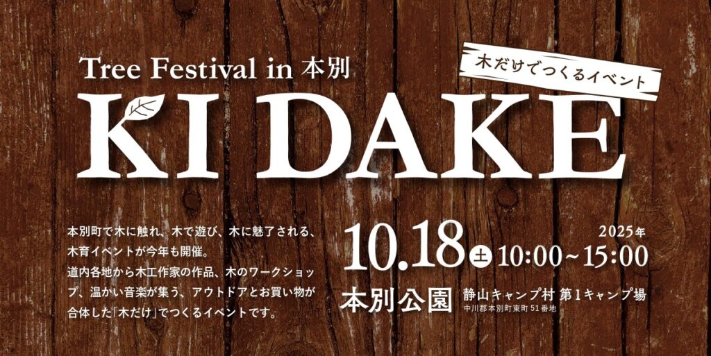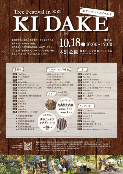 今年も10月18日(土)に本別公園で木だけでつくるイベント”Tree Festival in 本別「KIDAKE」”が開催されます。