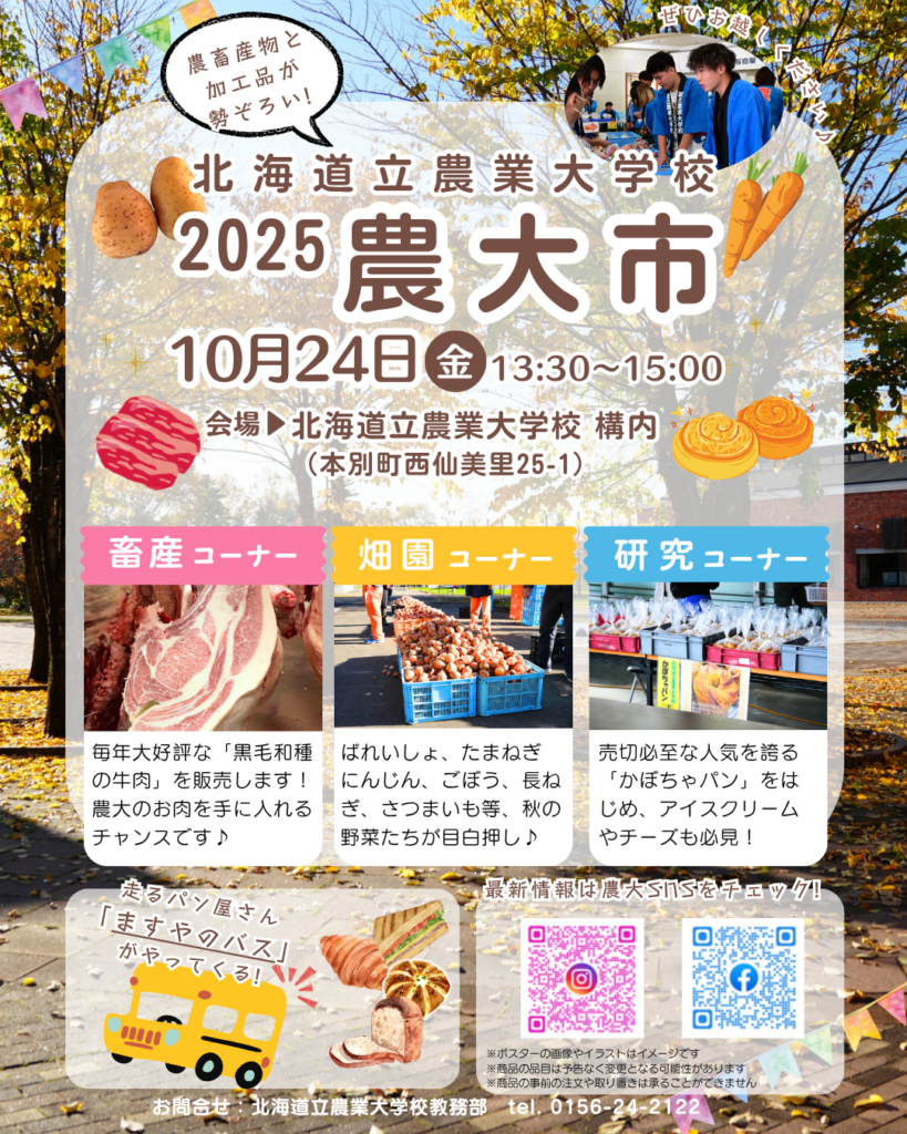 農大の農畜産物や加工品が手に入る秋の一大イベントとなっておりますので、この機会にぜひお越しください♪