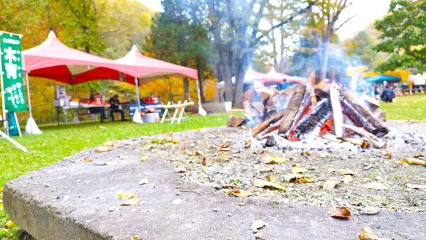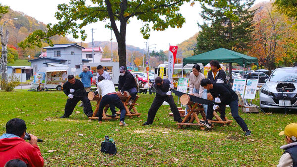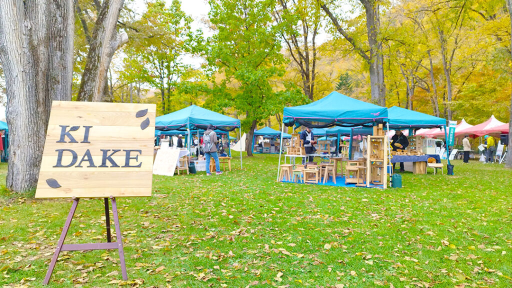 初参加の福川は「ホントに”木だけ”なのかな?」と半信半疑でした。しかし、紅葉の見ごろ迎える本別の木々に囲まれた会場で、道内各地の木工作家・作品が集まったほか、木製バットによるバッティングや丸太切りといった体験型ワークショップが行われるなど右も左も木だけ。まさに”KIDAKE”という名前の通りなんだな、と強く感じました。