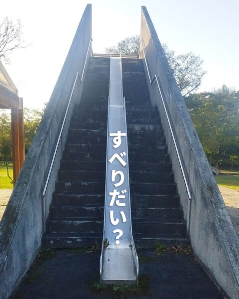 あと、すべりだいらしきものが階段の真ん中にあるんですよ。実は遊具だったり??
