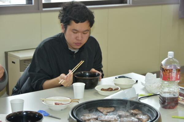 農大産和牛を幸せな顔をして頬張る隊員たち。くれぐれも体調には気をつけ、石川隊長指揮のもと牛舎管理を安全に行ってくれること祈っております。