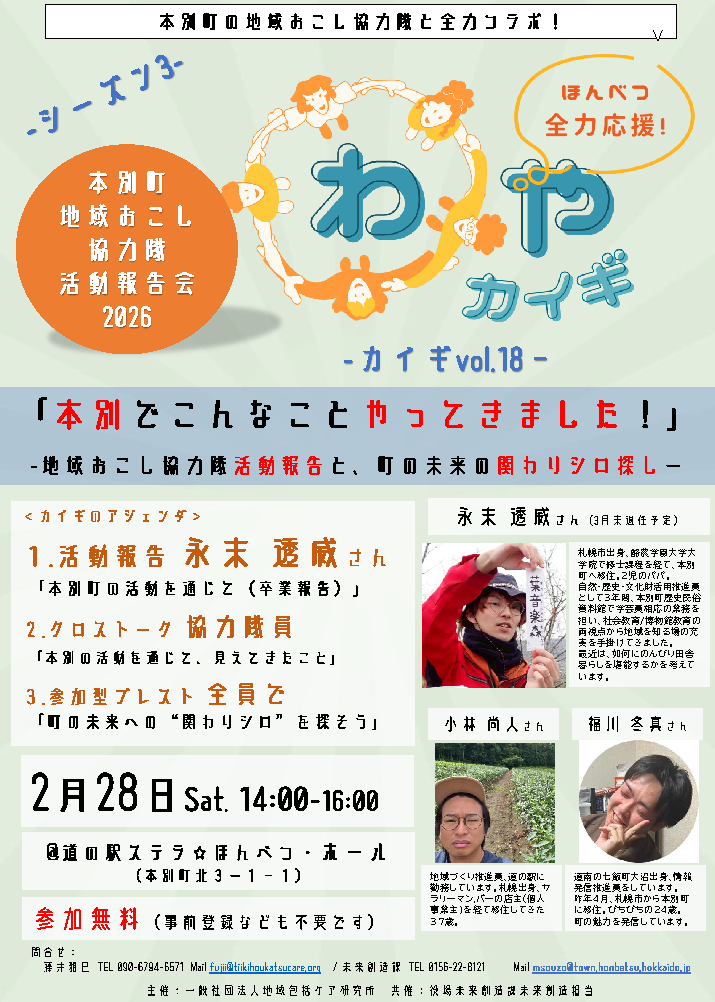 2月28日土曜、道の駅ステラ★ほんべつ多目的ホールにて、「本別町地域おこし協力隊活動報告会2026」を行います。