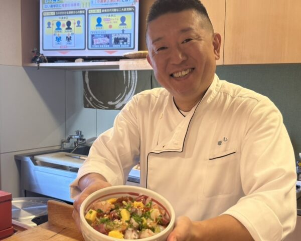 (写真)町外からのゲストをあたたかく迎える源すしの大将でもあるandほんべつ・代表理事の池田さん