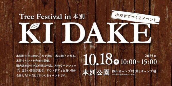 道内各地の木工作家の作品の出展、木のワークショップ、温かい食べ物、木の音楽が集い、アウトデアとショッピングが合体した「木だけ」でつくるイベントです。